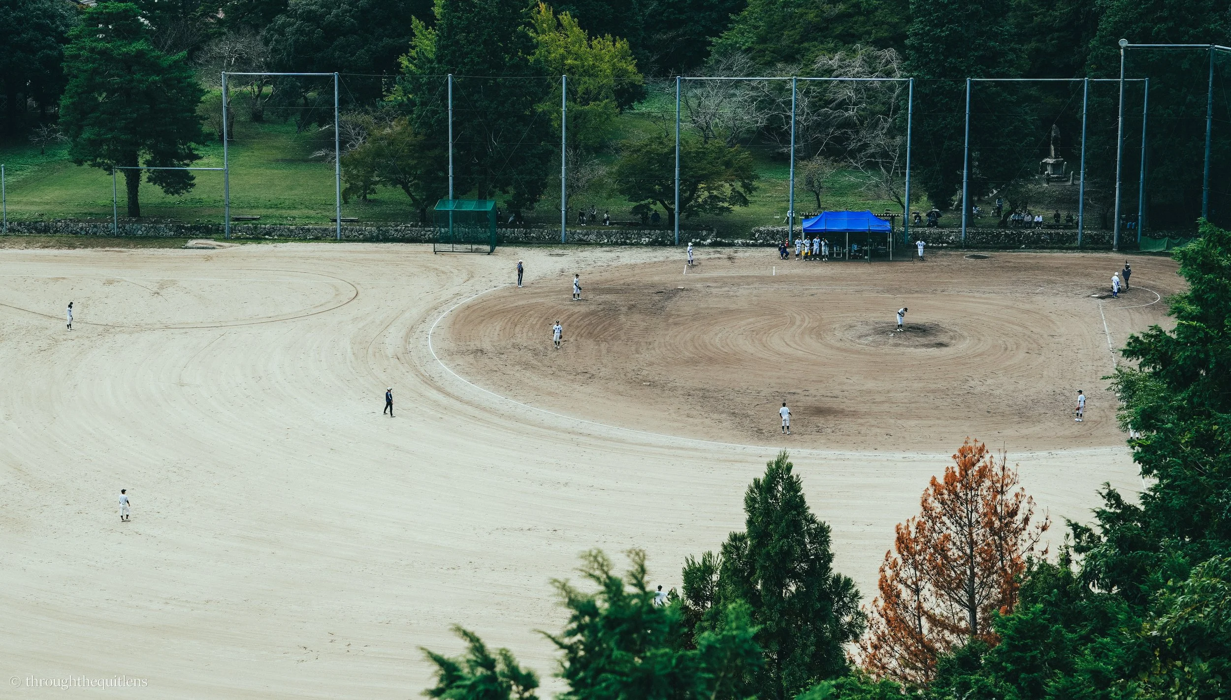 From the hillside, I watch young players on the baseball field below, their game unfolding in the wide, open air.